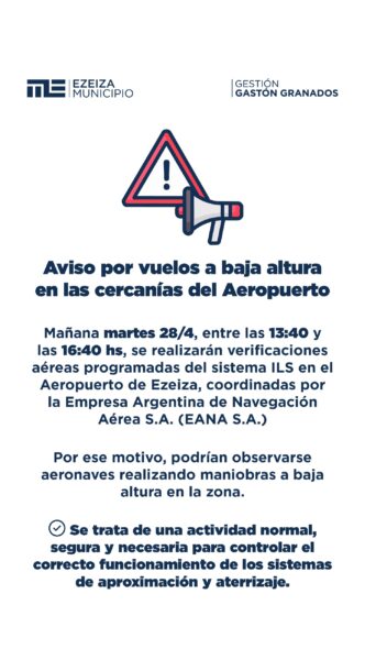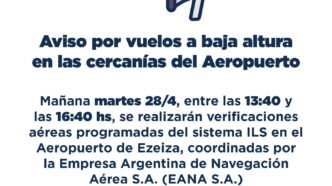 Este martes 28 de abril, entre las 13:40 y las 16:40 horas, se realizarán verificaciones aéreas programadas en el Aeropuerto Internacional de Ezeiza, coordinadas por la Empresa Argentina de…