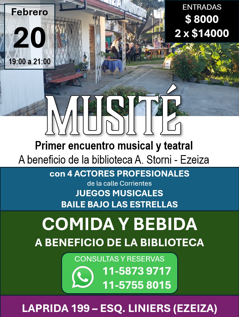 ► MUSITÉ. El 20 de febrero, de 19 a 21 horas, se realizará “Musité”, el primer encuentro musical y teatral a beneficio de la biblioteca. El evento contará con la participación de cuatro actores profesionales, juegos musicales, baile bajo las estrellas y servicio de comida y bebida. Las entradas tienen un valor de $8.000, con una promoción de dos por $14.000. Consultas y reservas: 11-5873-9717 y 11-5755-8015.