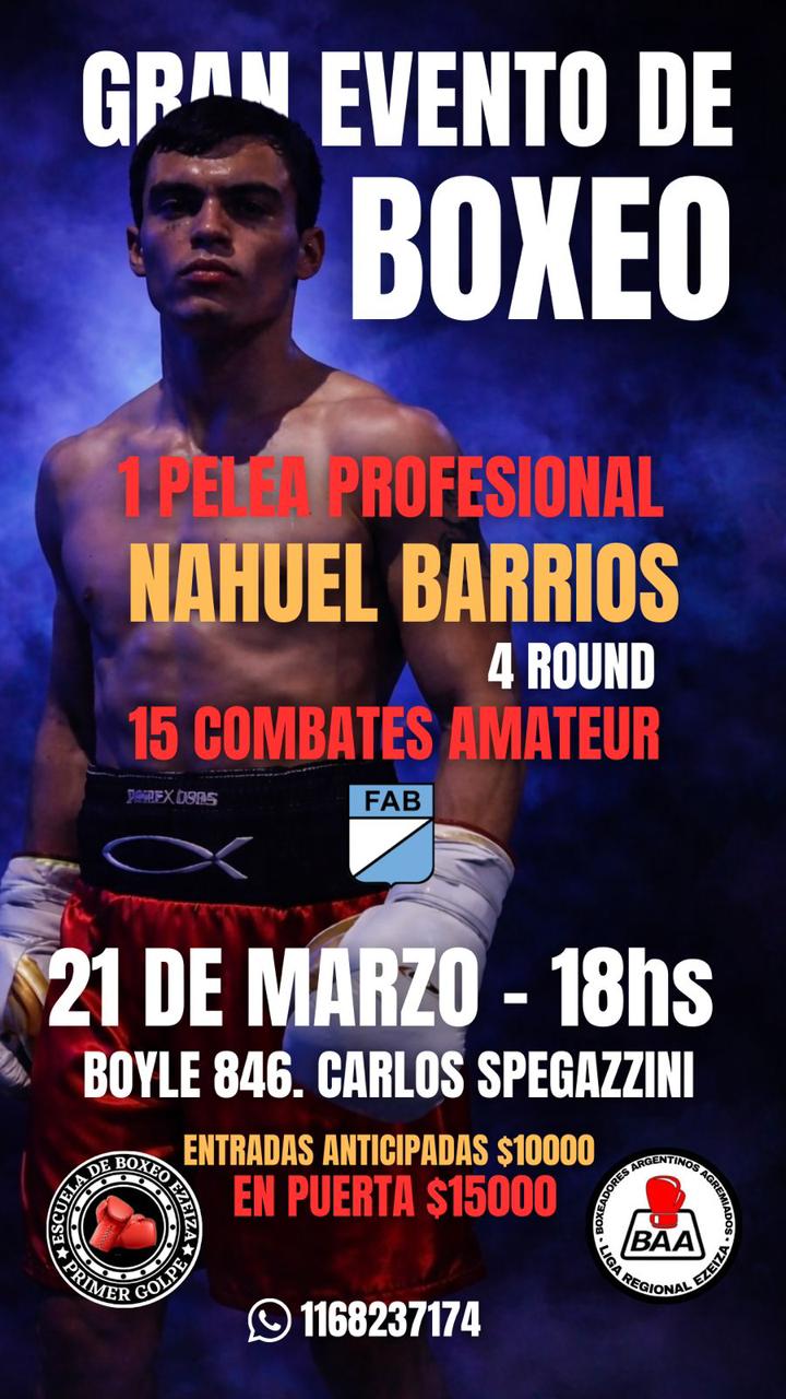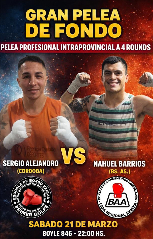 El próximo sábado 21 de marzo desde las 18 se efectuará una interesante velada boxística en Boyle 846, en Carlos Spegazzini, organizada por el entrenador de la FAB, Alfredo López, y sus hijos Checho y Flavio, acompañados por referentes de Boxeadores Agremiados Argentinos (BAA), de la mano de Damián Romero. Las entradas tendrán un costo de 10.000 pesos (anticipadas) y 15.000 pesos en el lugar del evento. Se realizarán 16 combates, entre exhibiciones amateurs y peleas profesionales. Se presentarán pupilos de la Escuela Primer Golpe como Micaela La Francesita Gómez, Elías The Machine Ramirez, Nicolás El Elegido Ferreira, Franco Gómez, Alex Pitbull Salinas, Brandon The Bulls Flores y muchos boxeadores más del distrito de Ezeiza. Estará presente Brian Carlos El Boxi Castaño. En la gran pelea de fondo, combatirán Sergio Alejandro (Córdoba) y Nahuel Barrios (Buenos Aires), con horario estipulado para las 22.