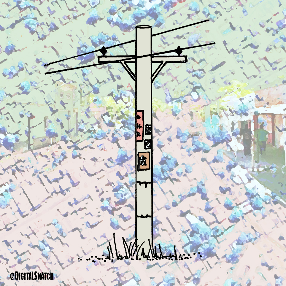 Flaco, medio torcido, con astillas, grietas y manchas de cal. Carteles de plomeros, tarotistas y otros servicios. Cables tirándole de los hombros. El poste de madera está en el barrio Alfonsina Storni. Sigue firme desde el siglo pasado, como un sobreviviente.