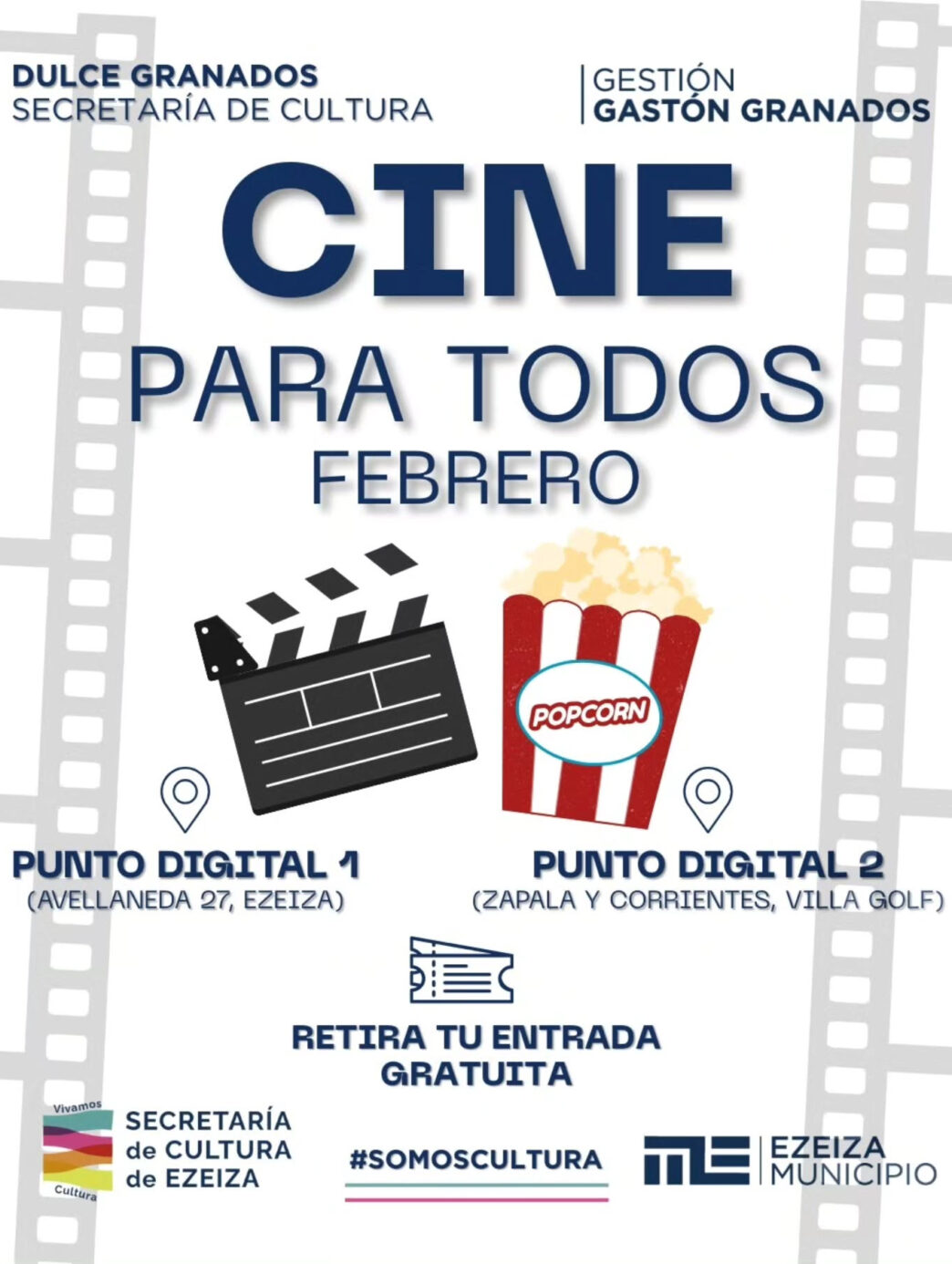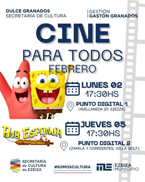 La Secretaría de Cultura, a cargo de Dulce Granados, confirmó el regreso del Ciclo Cine para Todos, con proyecciones en los Puntos Digitales Nº 1 (Avellaneda 27, Ezeiza) y Nº 2 (Zapala y Corrientes, Villa Golf), durante todo el mes de febrero.