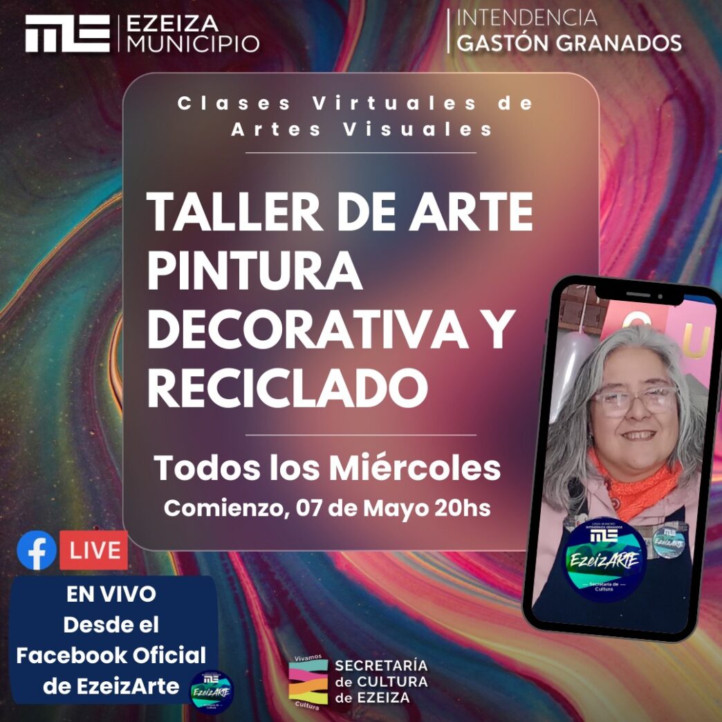 La Secretaría de Cultura del Municipio de Ezeiza a través de EzeizArte (Área de Artes Visuales de la Secretaría de Cultura del Municipio de Ezeiza) informó que a partir del 7 de mayo se encontrarán disponibles las clases virtuales gratuitas del taller de “Pintura decorativa y reciclado”. Las clases en vivo son transmitidas a través del Facebook Oficial de Ezeizarte, todos los miércoles a partir de las 20. El taller virtual gratuito es llevado a cabo por la artista local Andrea Fabiana Salvatierra, integrante de Ezeizarte y profesora del Taller Gratuito Municipal de Arte Decorativo y Reciclado.