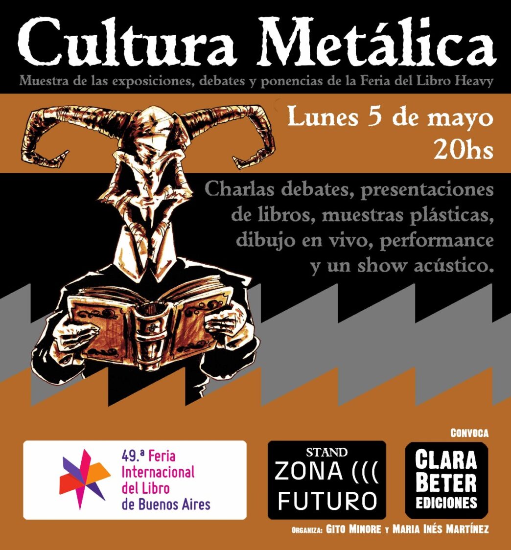 Charla Cultura Metálica. Lunes 5 de mayo, de 20 a 21.30, en el stand Zona Futuro (Pabellón Amarillo), 49º Feria Internacional del Libro de Buenos Aires, La Rural. Convoca: Clara Beter. Organiza: Gito Minore y María Inés Martínez.
