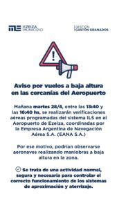 Este martes 28 de abril, entre las 13:40 y las 16:40 horas, se realizarán verificaciones aéreas programadas en el Aeropuerto Internacional de Ezeiza, coordinadas por la Empresa Argentina de Navegación Aérea (EANA) S.A.