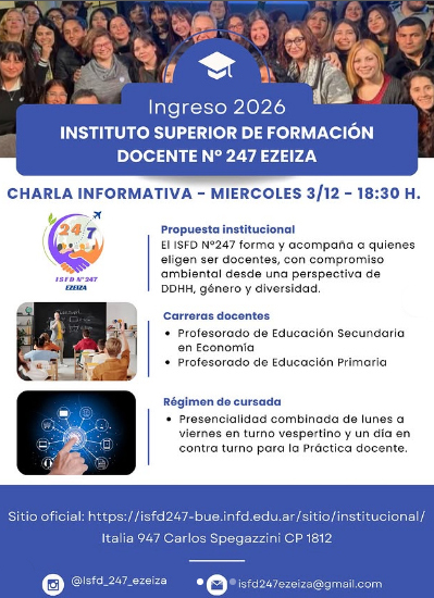 El Instituto Superior de Formación Docente Nº 247 de Ezeiza anunció la apertura del ingreso 2026 e invita a la comunidad a participar de una charla informativa que se realizará el miércoles 3 de diciembre a las 18:30 horas, a realizarse en Italia 947, de Carlos Spegazzini. Durante el encuentro se brindarán detalles sobre la propuesta institucional, las carreras disponibles y el régimen de cursada. Las carreras docentes disponibles son los profesorados de Educación Primaria y de Educación Secundaria en Economía. Hay vacantes para 1°, 2° y 3°. La modalidad de cursada combina clases presenciales de lunes a viernes en turno vespertino, con una jornada adicional en contra turno destinada a la práctica docente. Consultas: isfd247ezeiza@gmail.com | Instagram: @isfd_247_ezeiza