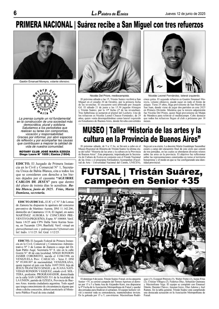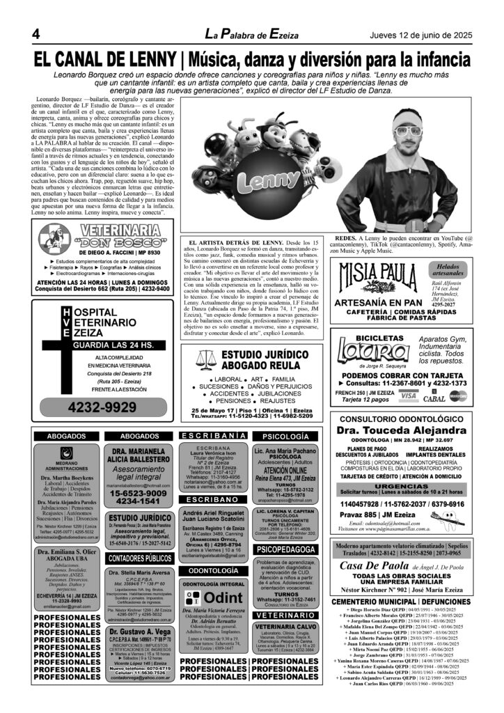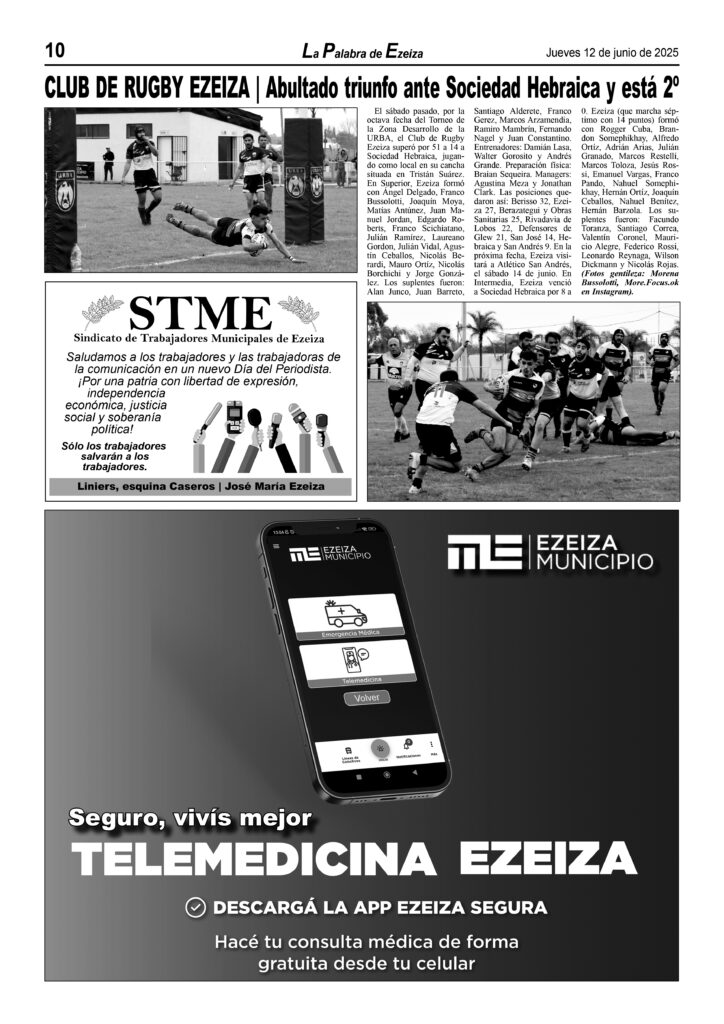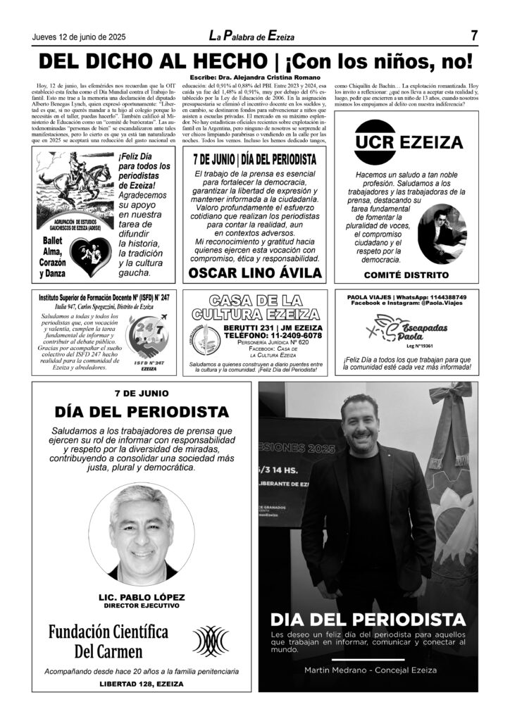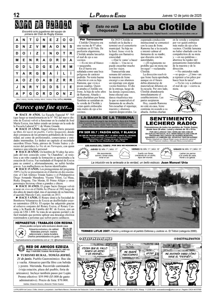LA PALABRA DE EZEIZA SALE TODOS LOS JUEVES. Atención: Tucumán 142, José María Ezeiza, lunes a viernes de 9 a 13 horas. Teléfono: (5411) 4232-6274. WhatsApp: 11-2338-2539. Email: ezeizaediciones@yahoo.com.ar