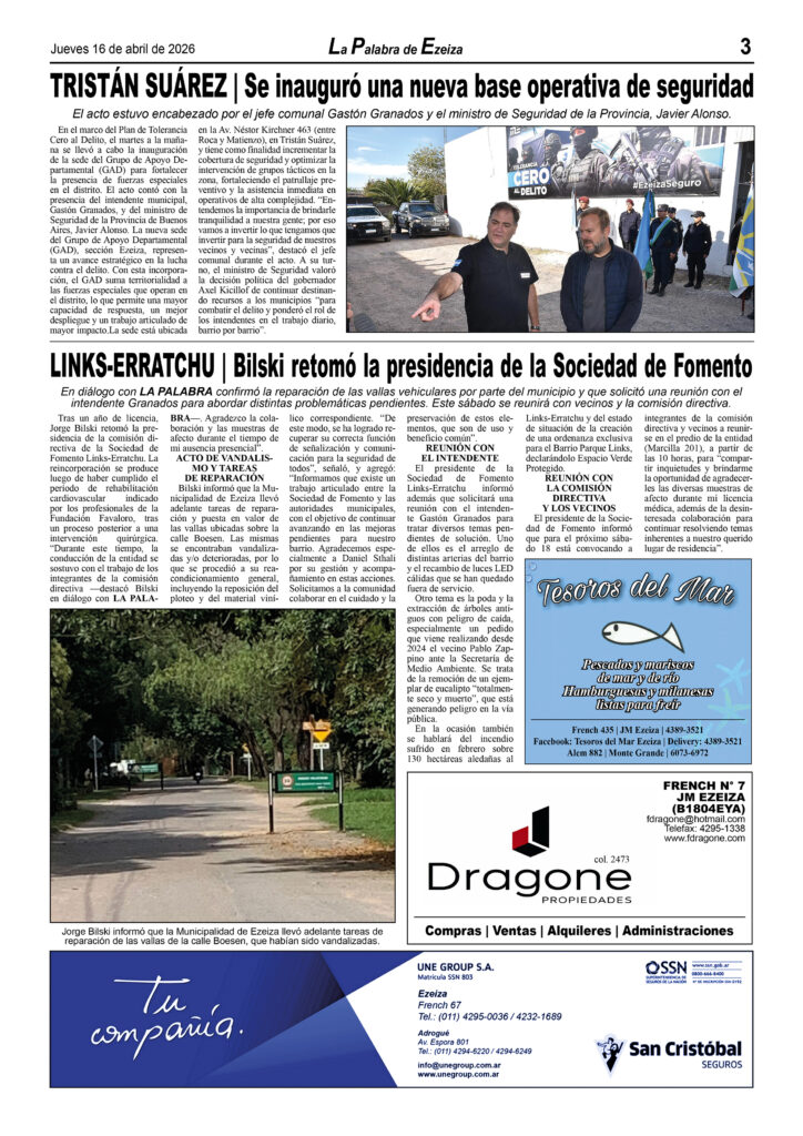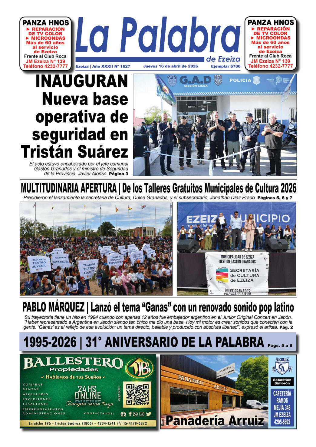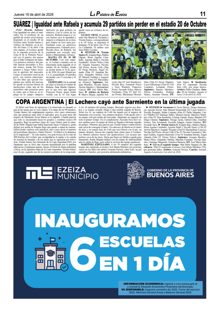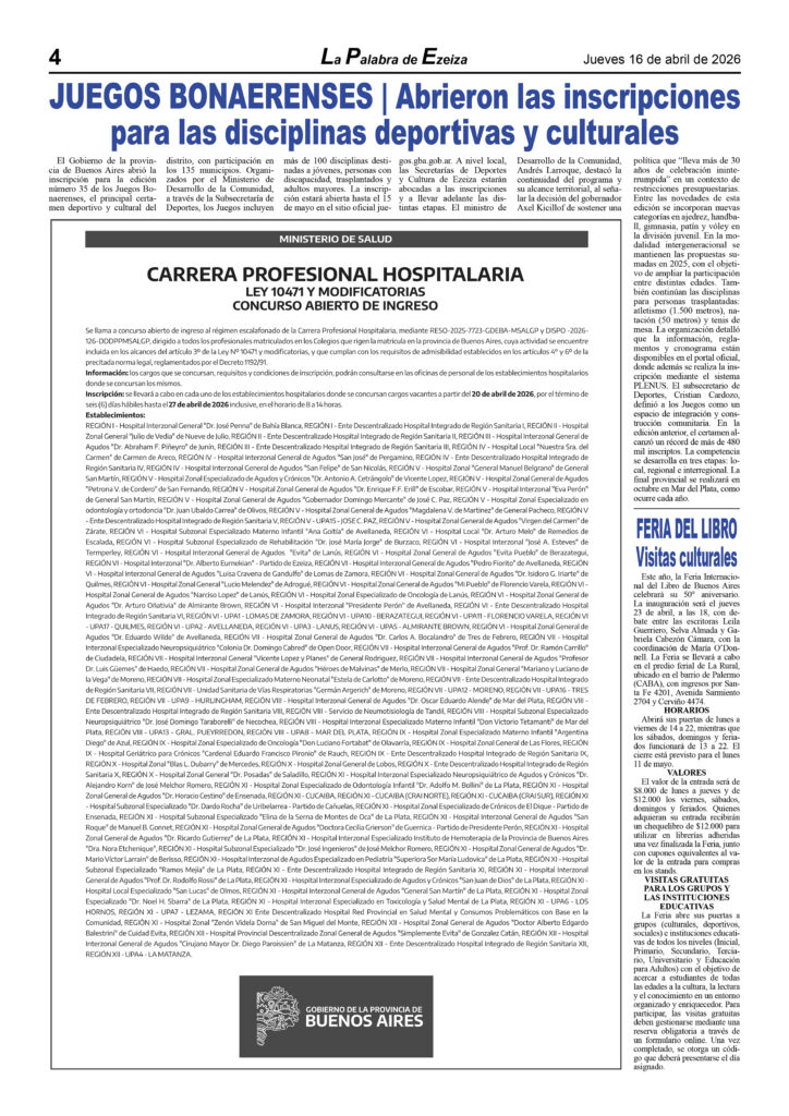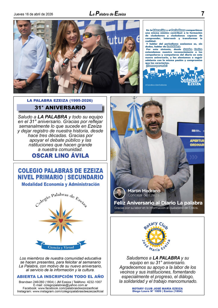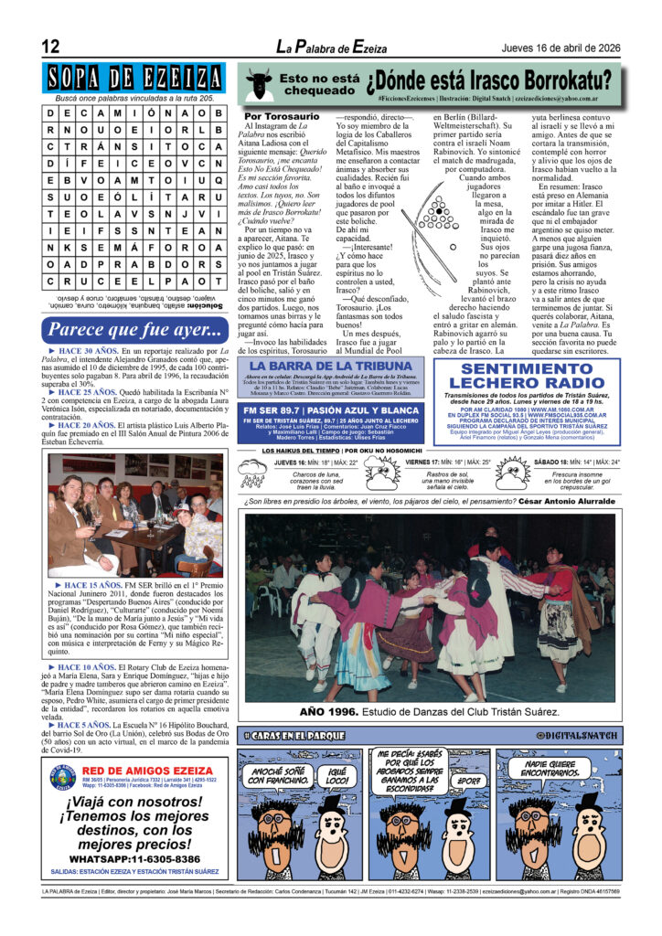 Ya puede conseguirse en todos los kioscos de diarios y revistas del distrito de Ezeiza (Barrio Uno, Canning, José María Ezeiza, Tristán Suárez y Carlos Spegazzini) la edición papel Nº 1627 del semanario La Palabra de Ezeiza del jueves 16 de abril de 2026. Valor: $700.