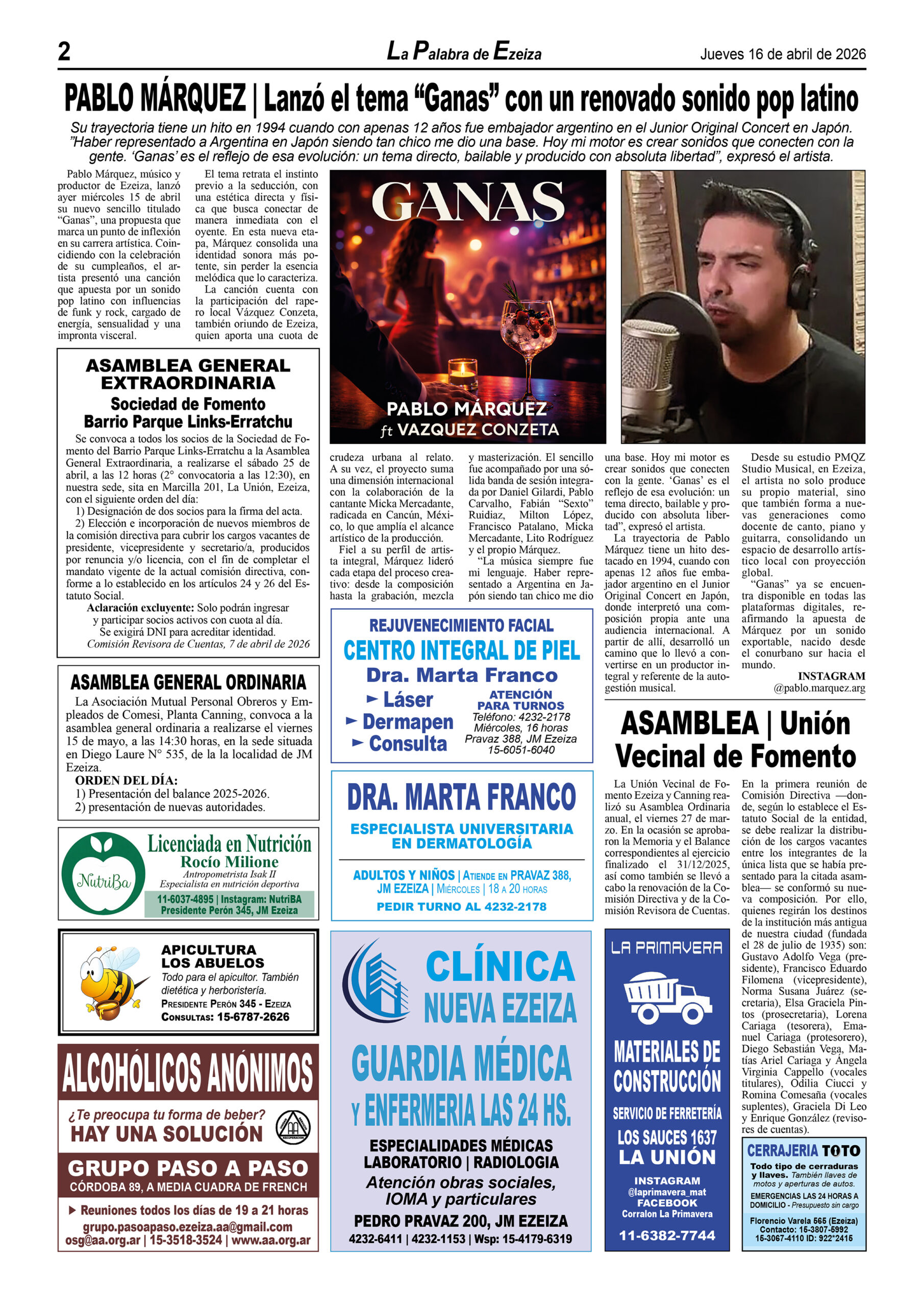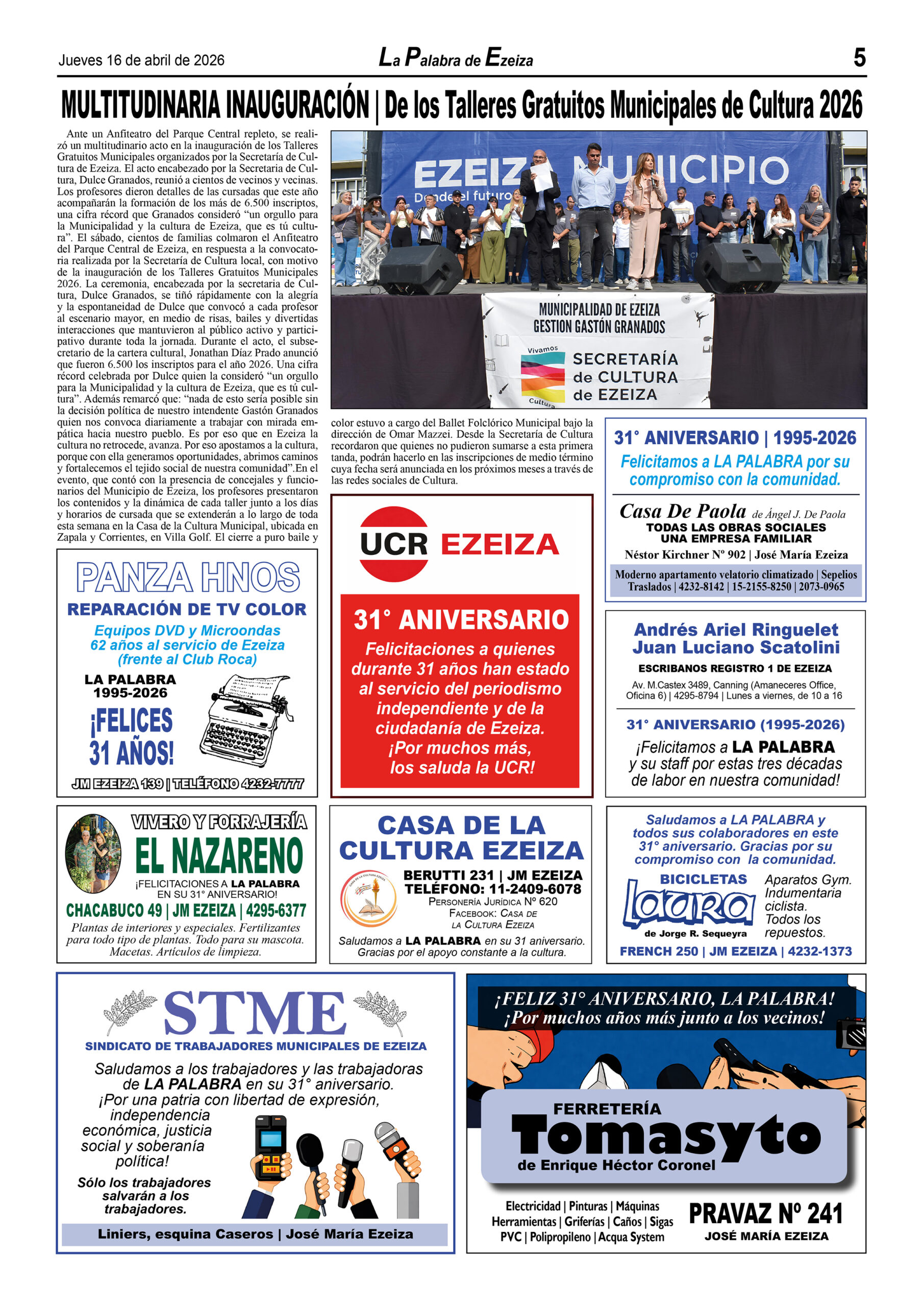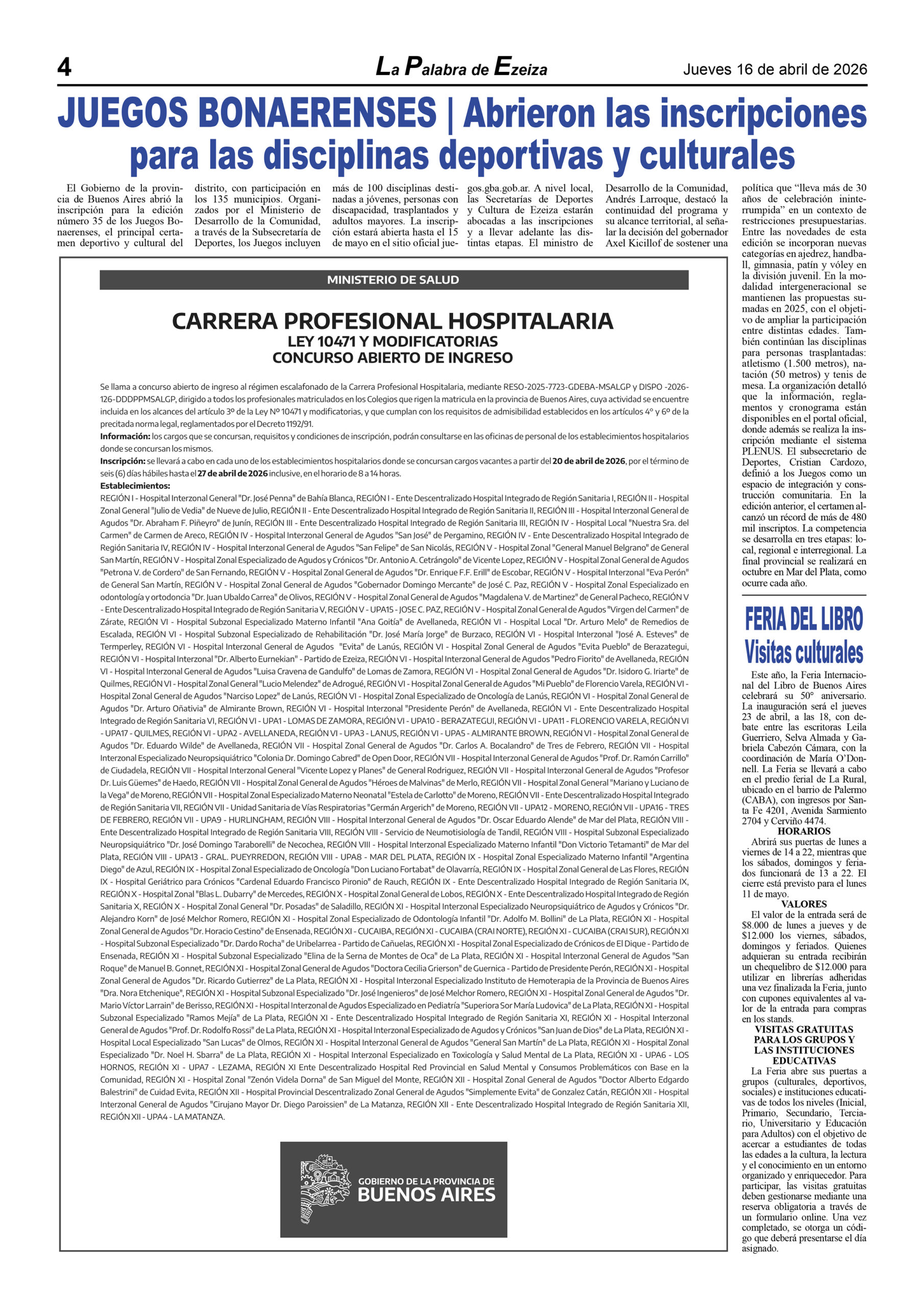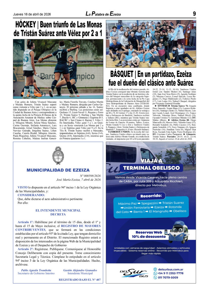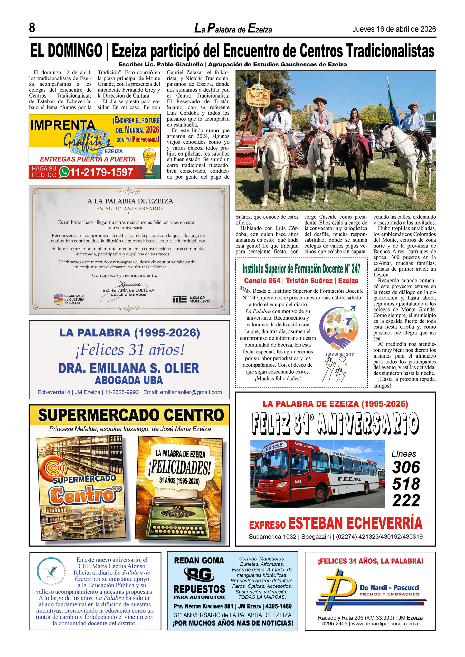 Ya puede conseguirse en todos los kioscos de diarios y revistas del distrito de Ezeiza (Barrio Uno, Canning, José María Ezeiza, Tristán Suárez y Carlos Spegazzini) la edición papel Nº 1627 del semanario La Palabra de Ezeiza del jueves 16 de abril de 2026. Valor: $700.