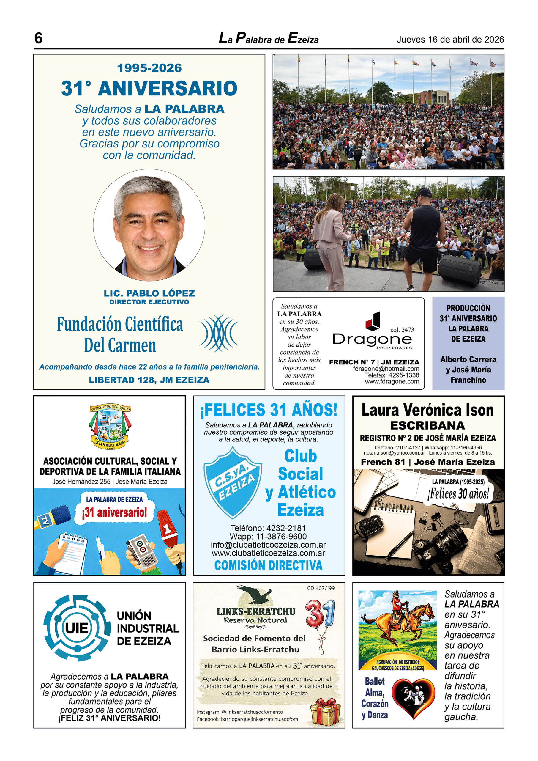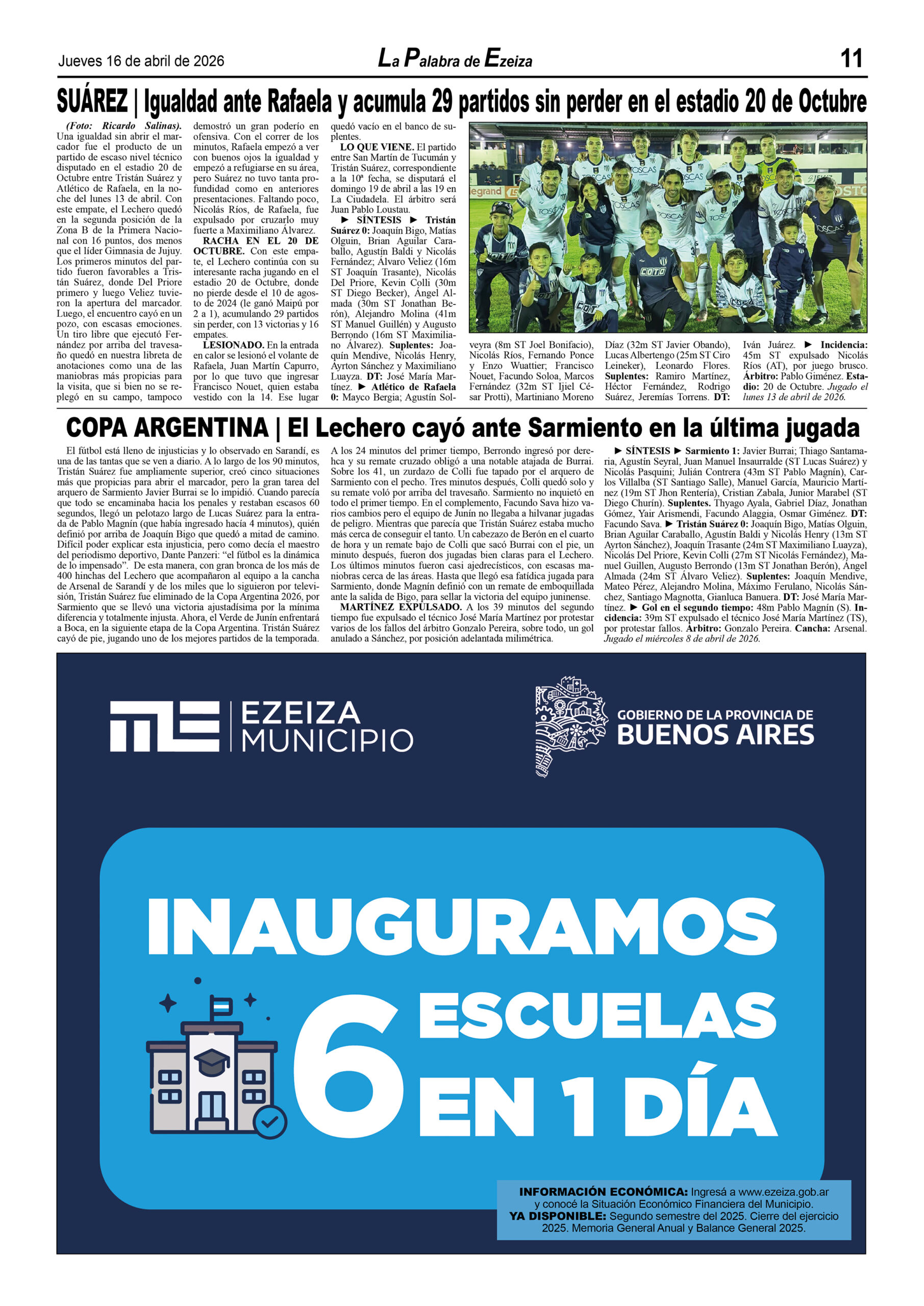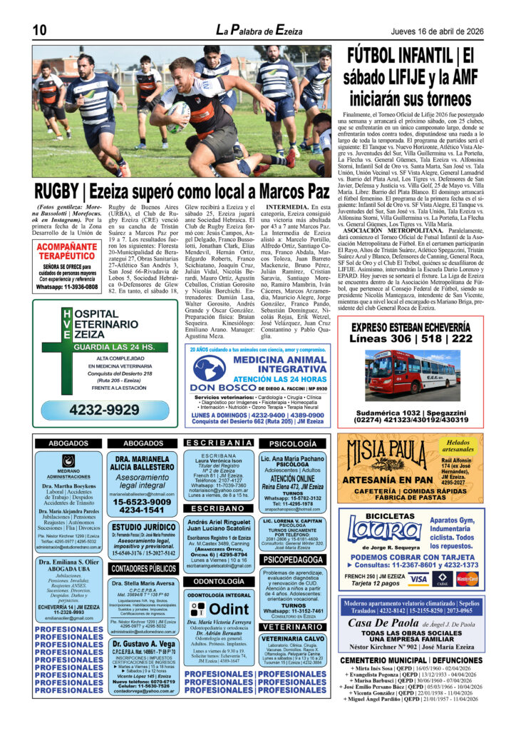 LA PALABRA DE EZEIZA SALE TODOS LOS JUEVES. Atención: Tucumán 142, José María Ezeiza, lunes a viernes de 9 a 13 horas. Teléfono: (5411) 4232-6274. WhatsApp: 11-2338-2539. Email: ezeizaediciones@yahoo.com.ar