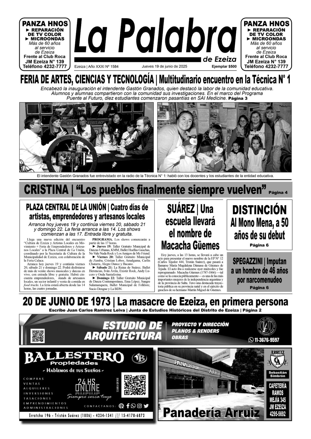 Ya puede conseguirse en todos los kioscos de diarios y revistas del distrito de Ezeiza (Barrio Uno, Canning, José María Ezeiza, Tristán Suárez y Carlos Spegazzini) la edición papel Nº 1583 del semanario La Palabra de Ezeiza del jueves 19 de junio de 2025. Valor: $500.