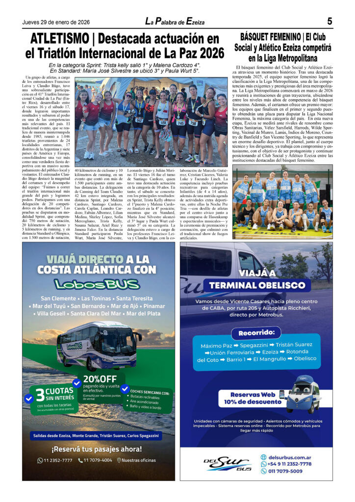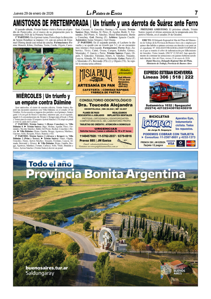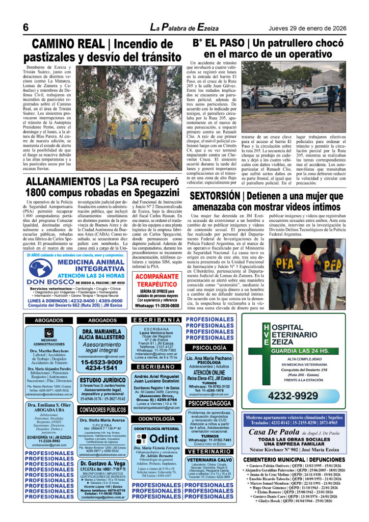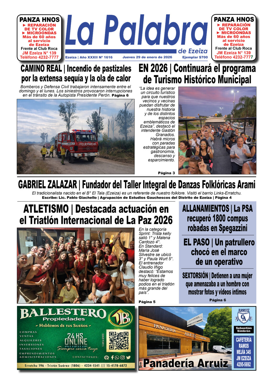 Ya puede conseguirse en todos los kioscos de diarios y revistas del distrito de Ezeiza (Barrio Uno, Canning, José María Ezeiza, Tristán Suárez y Carlos Spegazzini) la edición papel Nº 1616 del semanario La Palabra de Ezeiza del jueves 29 de enero de 2026. Valor: $700.
