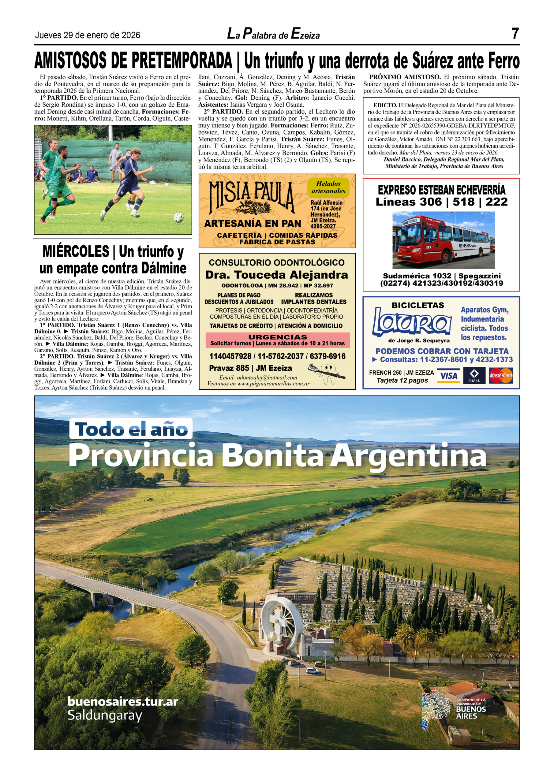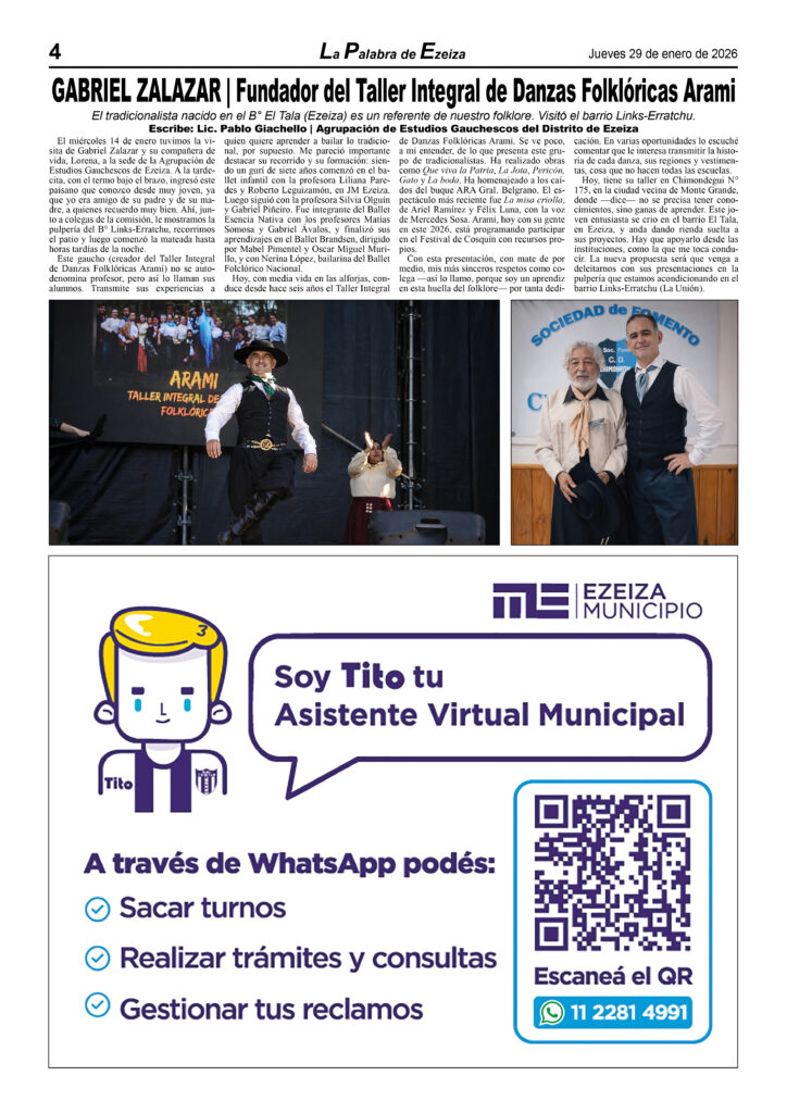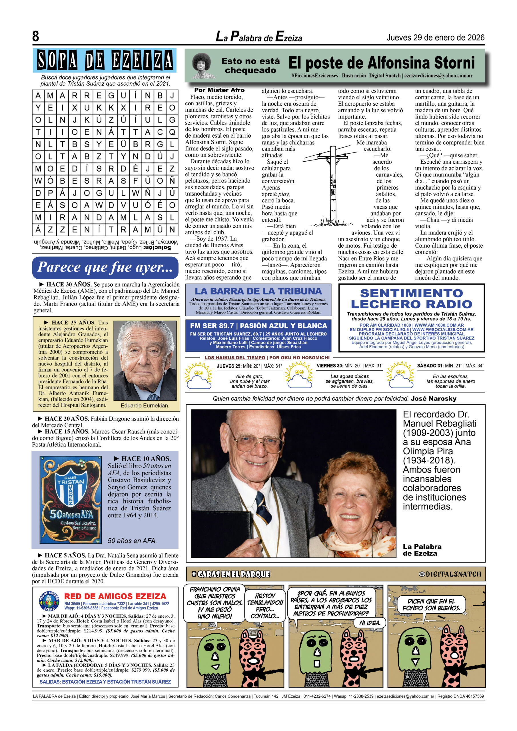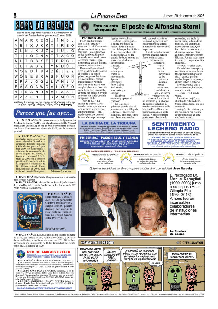 LA PALABRA DE EZEIZA SALE TODOS LOS JUEVES. Atención: Tucumán 142, José María Ezeiza, lunes a viernes de 9 a 13 horas. Teléfono: (5411) 4232-6274. WhatsApp: 11-2338-2539. Email: ezeizaediciones@yahoo.com.ar