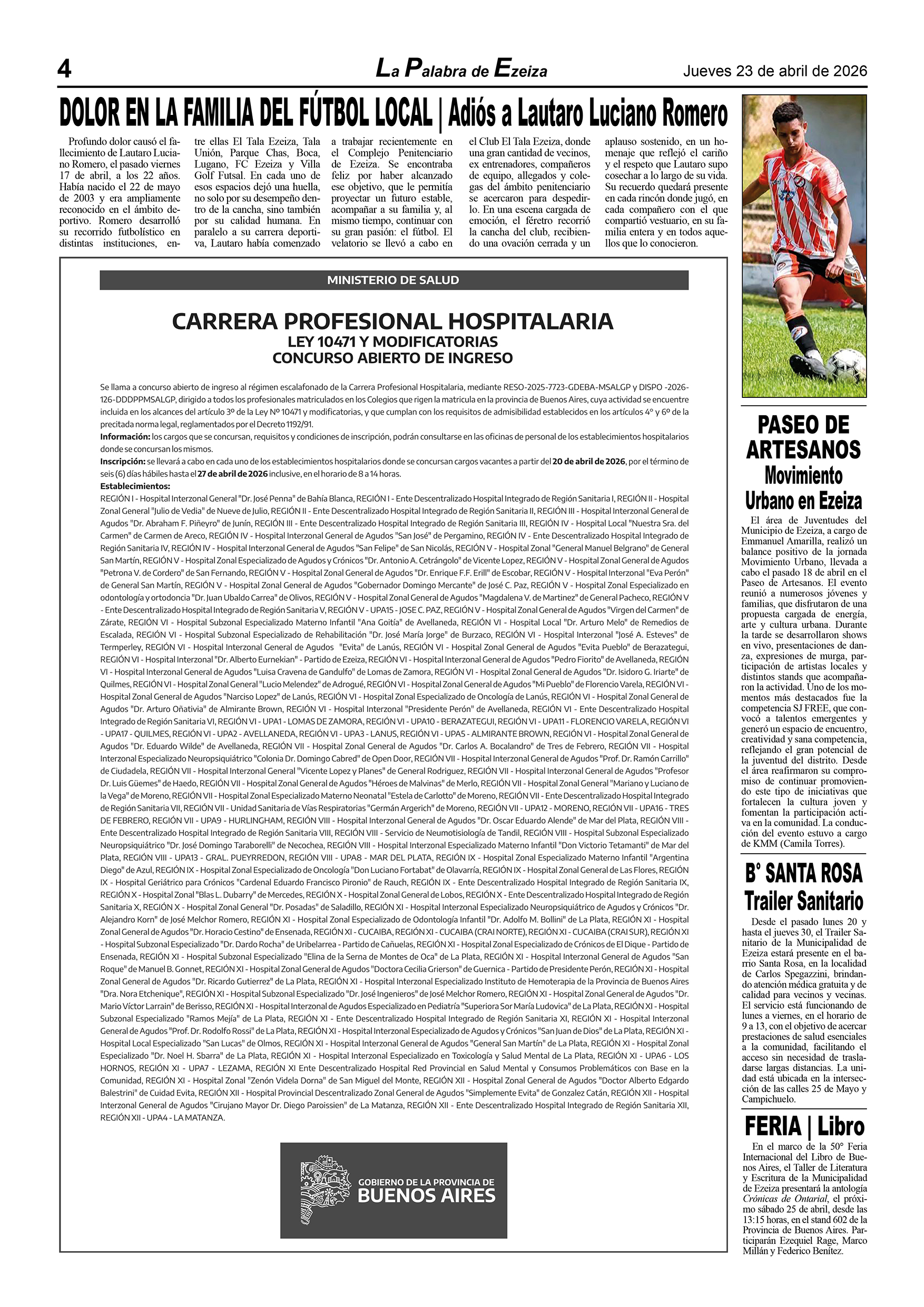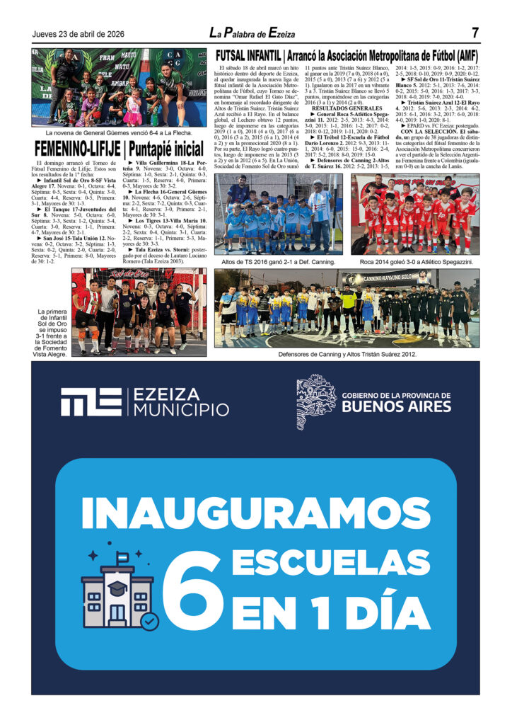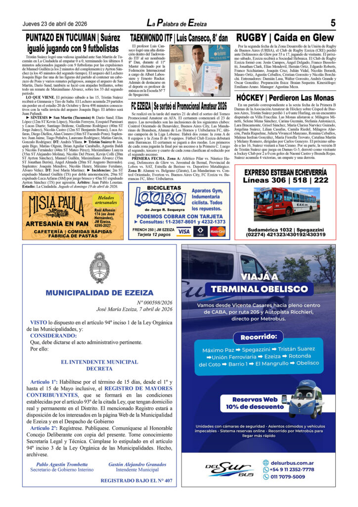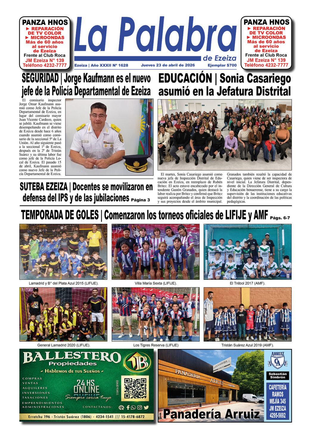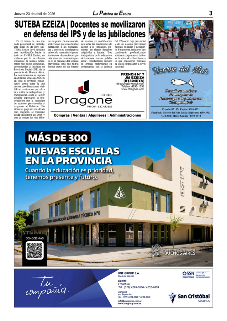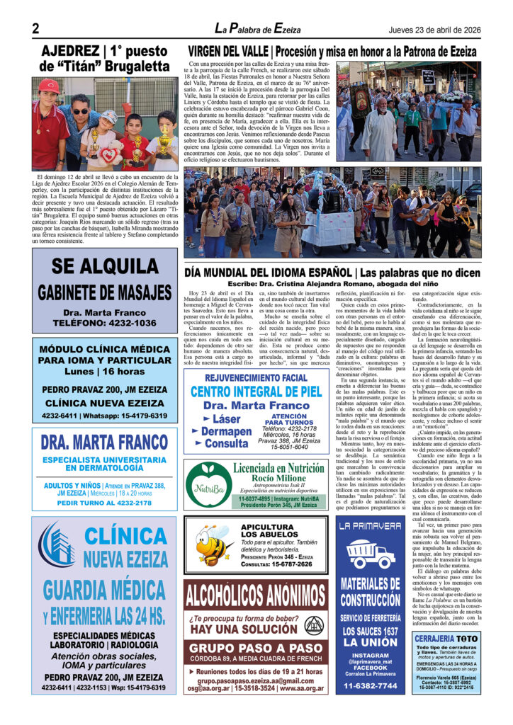 Ya puede conseguirse en todos los kioscos de diarios y revistas del distrito de Ezeiza (Barrio Uno, Canning, José María Ezeiza, Tristán Suárez y Carlos Spegazzini) la edición papel Nº 1628 del semanario La Palabra de Ezeiza del jueves 23 de abril de 2026. Valor: $700.