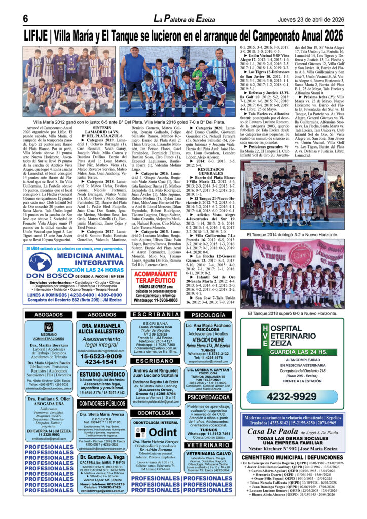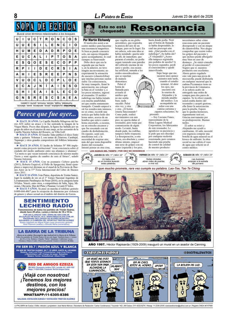 LA PALABRA DE EZEIZA SALE TODOS LOS JUEVES. Atención: Tucumán 142, José María Ezeiza, lunes a viernes de 9 a 13 horas. Teléfono: (5411) 4232-6274. WhatsApp: 11-2338-2539. Email: ezeizaediciones@yahoo.com.ar