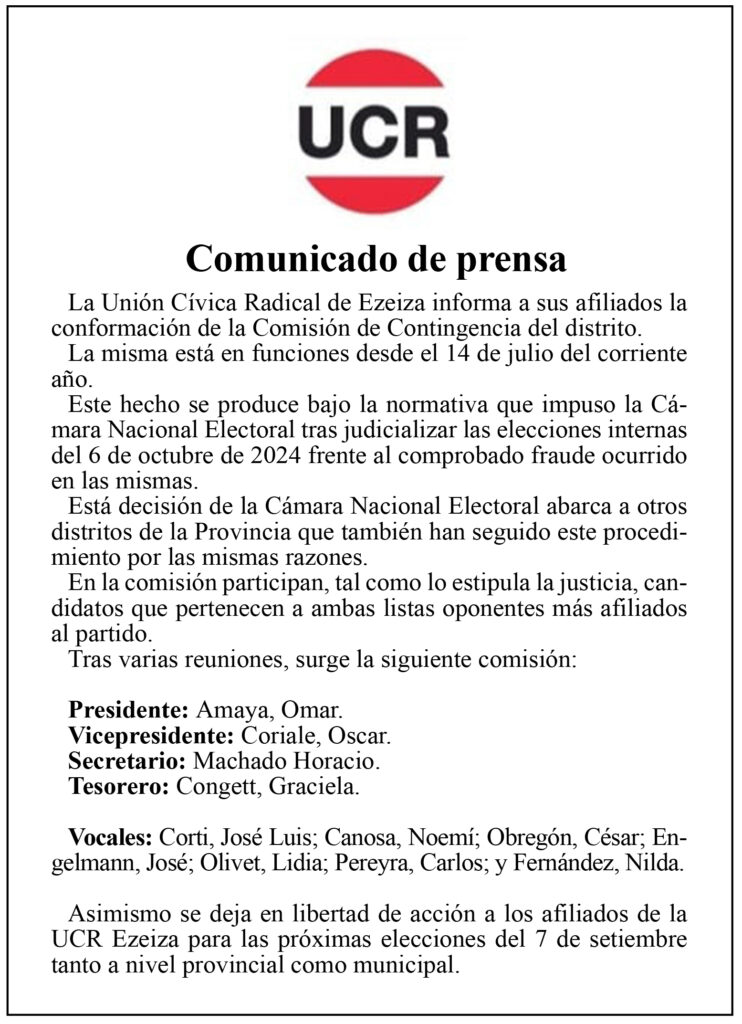 Así lo anunció la Comisión de Contingencia de la Unión Cívica Radical de Ezeiza, presidida por Oscar Amaya (presidente), Oscar Coriale (vice), Horacio Machado (secretario) y Graciela Congett (tesorera). Compartimos el comunicado completo.